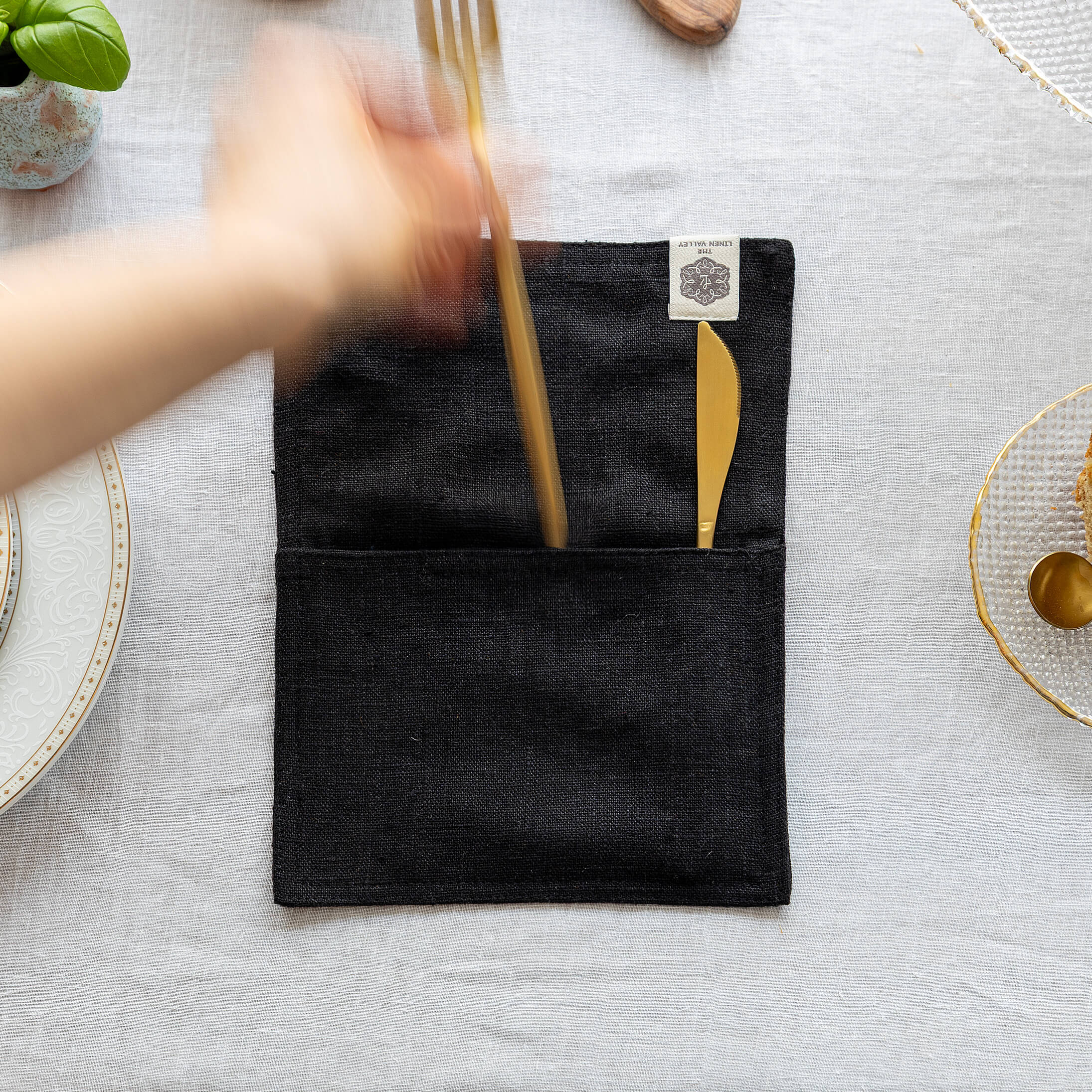 Black linen cutlery holder will make your table setting look neat and tidy. Decorative cutlery pouch can be paired with table napkins or other table linens, mixed or matched.