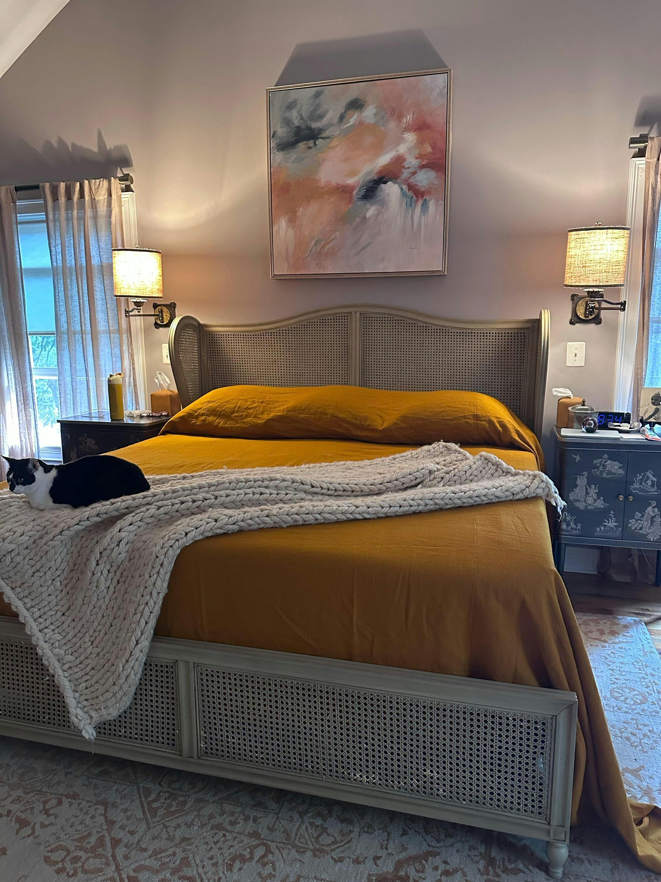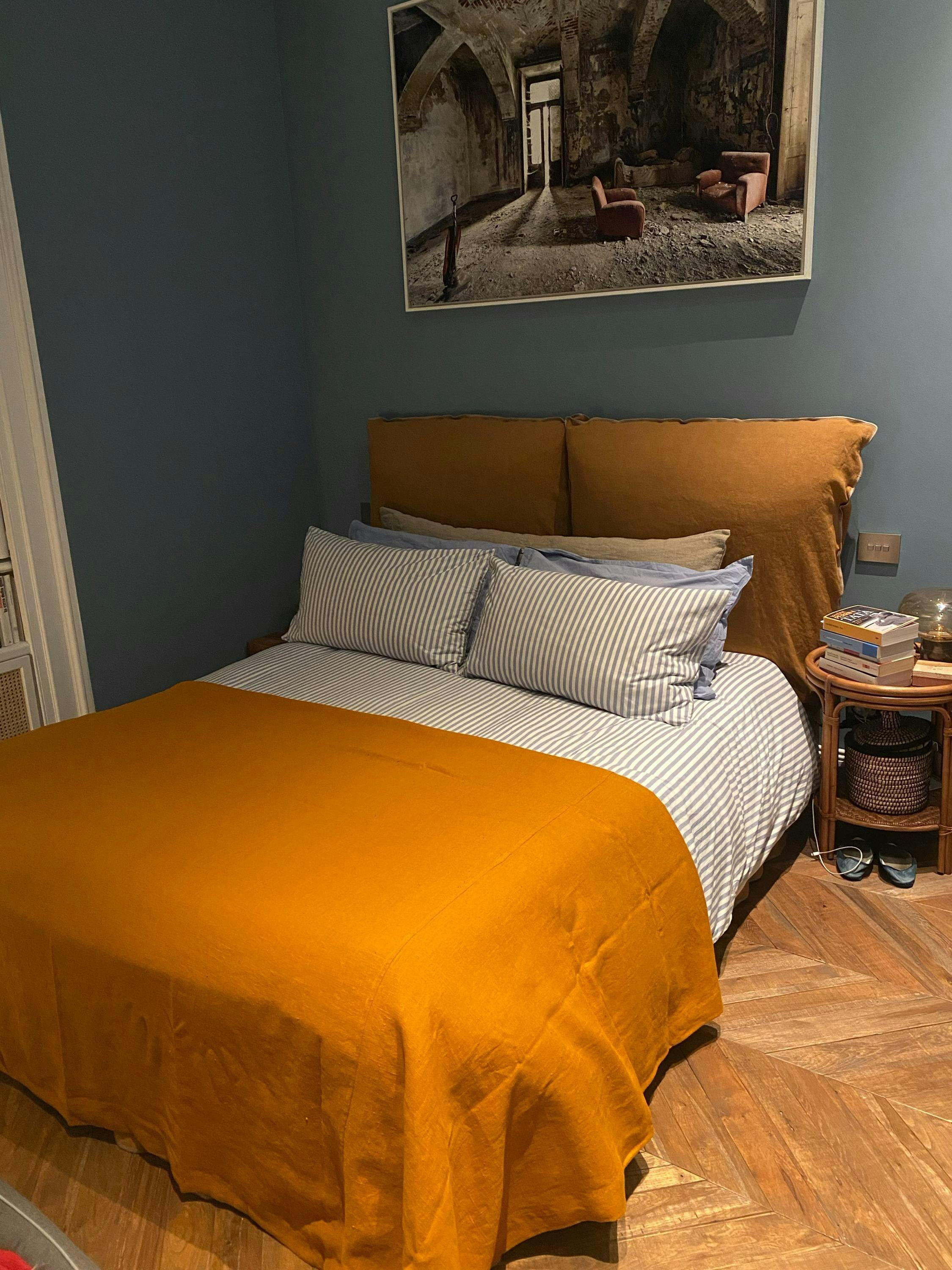 The amber yellow linen bedspread has been carefully designed to suit a wide range of interior styles and blend perfectly in both classic and contemporary home spaces.